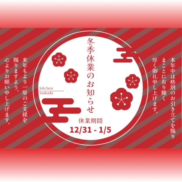 休業期間中はご不便をおかけいたしますが、何卒ご了承くださいますようお願い申し上げます。2026年も変わらぬお引き立てを賜りますよう、よろしくお願い申し上げます洋食キッチンツカダ店主
