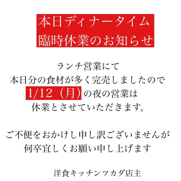 1/12(月)ディナーお休みのお知らせ